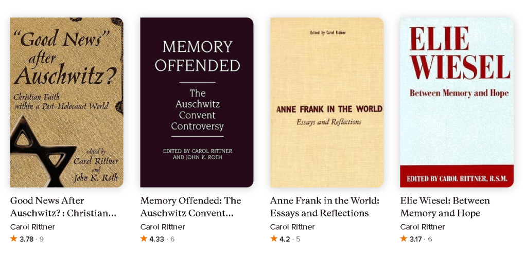 Dr. Rittner is the author, editor or co-editor of numerous essays and books about the Holocaust and Christian-Jewish relations, including Memory Offended: The Auschwitz Convent Controversy (Westport, CT: Praeger, 1991); What’s the “Good News” After Auschwitz? (Macon, GA: Mercer University Press, 2001), Pius XII and the Holocaust (London and New York: University of Leicester Press/Continuum Publishers, 2002); No Going Back:Letters to Pope Benedict XVI on the Holocaust, Christian-Jewish Relations and the State of Israel (Laxton, UK: Quill Press, 2009); The Holocaust and Nostra Aetate: Toward A Greater Understanding (Greensburg, PA: Seton Hill University Press, 2017); and The Holocaust and the Christian World, 2nd ed. (Mahwah, NJ: A Stimulus Book, Paulist Press, 2019). She is the co-editor, with John K. Roth, of the forthcoming book Stress Test: The Hamas-Israel War and Christian-Jewish Relations (iPub Global, 2025).